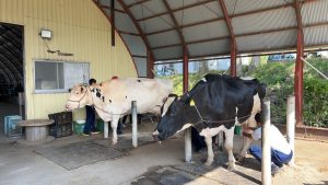 牛舎で乳絞りをします。乳牛に触れる貴重な体験です。