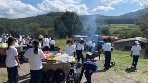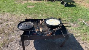 飯盒でご飯を炊き、先程作ったソーセージ等を食材として、ダッチオーブンでミルクポトフを作って食べます。つかみ取りしたニジマスも焼いて食べます。