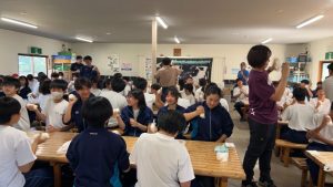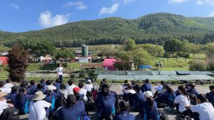 お世話になった牧場の方へお礼のあいさつをします。牧場では様々な体験を通して、命の大切さを学びました。