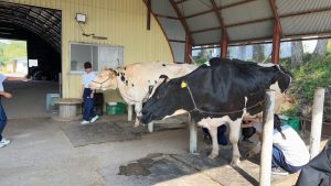 牛舎で乳絞りをします。乳牛に触れる貴重な体験です。