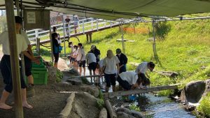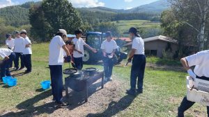 飯盒でご飯を炊き、先程作ったソーセージ等を食材として、ダッチオーブンでミルクポトフを作って食べます。つかみ取りしたニジマスも焼いて食べます。