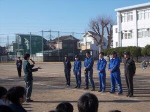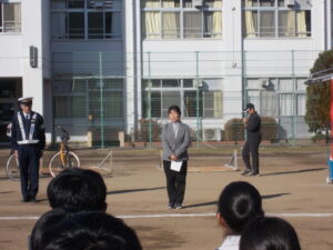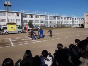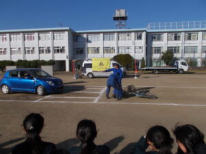 小金井警察署交通課の方より交通安全講話をいただいた後、スタントマンの方々による交通事故の事例紹介が行われました。